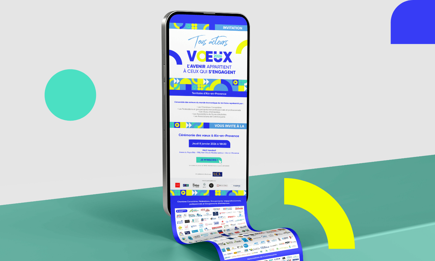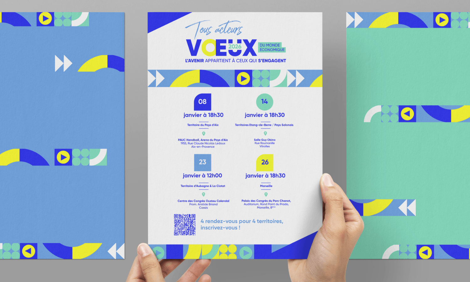Klarté a conçu l’identité graphique de la campagne de vœux 2026 pour « TOUS ACTEURS » de la CCI Aix-Marseille-Provence.